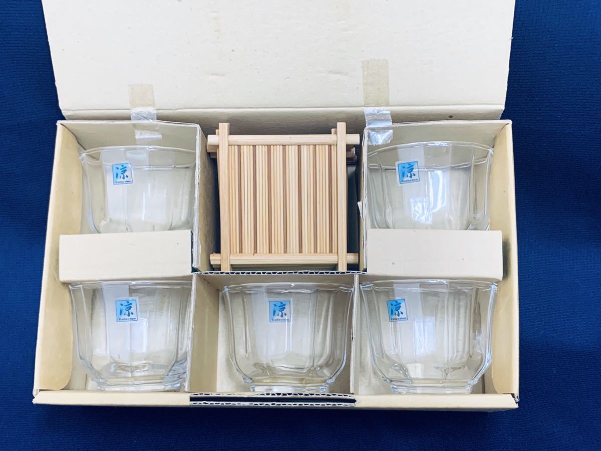 - 60▼ 冷茶セット 茶托付き ガラス 食器 5客セット 専用の箱付き 未使用品 管理2203 C-16