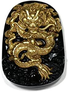 - 【天然石 ペンダントトップ】オブシディアン 龍彫り オーバル型 黄金龍 【天然石】