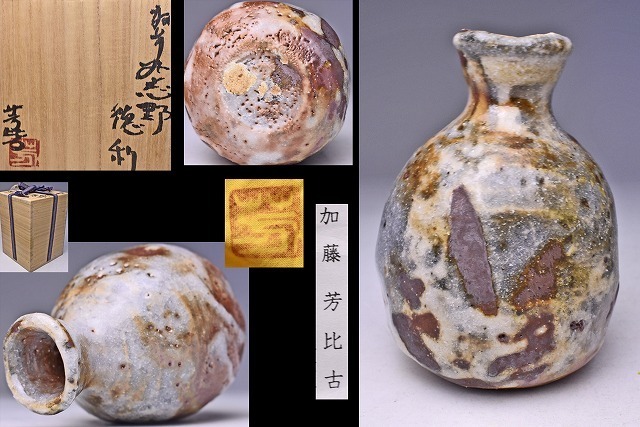 > 加藤芳比古 ★ 鼠志野徳利 ★ 共箱共布栞 ★ 景色抜群 ★ 上作 ★ 窯変見事 ★ 美濃焼 ★ 月形那比古 師事