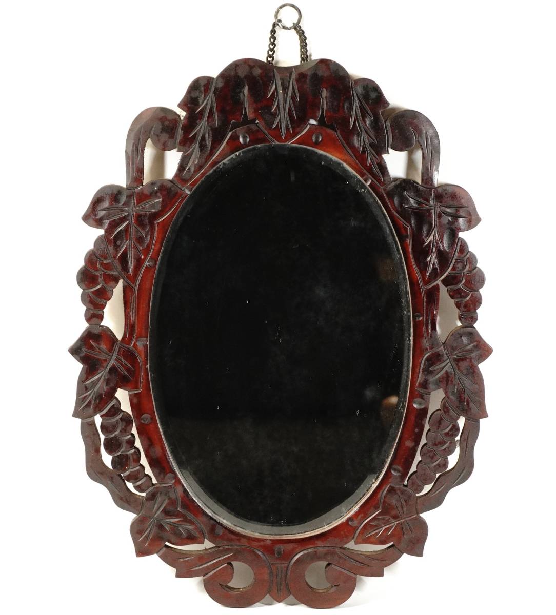 - 経年の深い艶、味わいが魅力です!昭和ビンテージ 木製葡萄紋彫刻壁掛鏡 ウッドパネル ウォールミラー 幅30.5㎝ 高さ40㎝ TKM