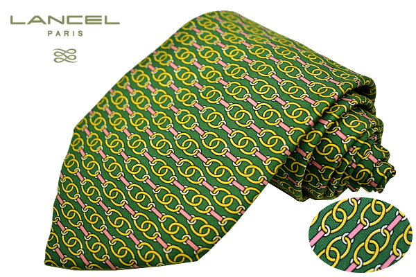 > N-2512★送料無料★美品★LANCEL PARIS ランセル パリ HAND MADE★正規品 フランス製 グリーン ベルト チェーン パターン柄 シルクネクタイ
