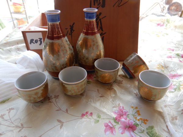 > 壺つぼR03 酒瓶揃い 九谷焼 未使用 洋山 5おちょこ2徳利 24x24x10cm箱入り