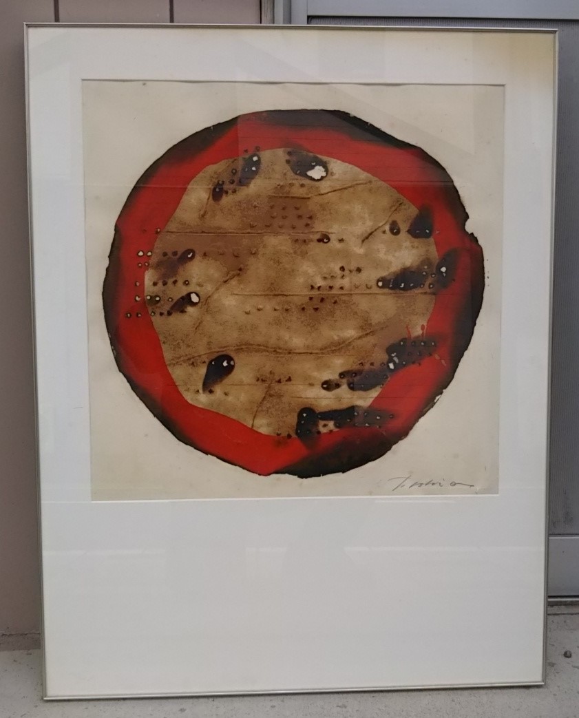 - !秀品!水彩画「コラージュアート」ガラス仕様【サインT,石尾?】ガラス角、欠けあり】(詳細不明)