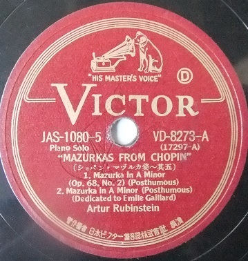 ショパン CHOPIN 「マズルカ集」 「MAZURKA FROM CHOPIN」 1.Mazurka in Aminor(posthumous)(dedicated to Emile Gaillard) 2.Mazurka in Bminor 3.Mazurka in Gminor 4.Mazurka in Cminor ピアノ アルトゥール・ルービンシュタイン piano Arthur Rubinstein 盤にヒビが数か所と、多少のスレ、汚れがございます。ノイズや針飛びがおこる可能性がございます。盤に反りがございます。盤のみ。発売元 VICTOR ノークレームノーリターンでお願い致します。上記の事をご理解・ご納得の上で入札をお願い致します。