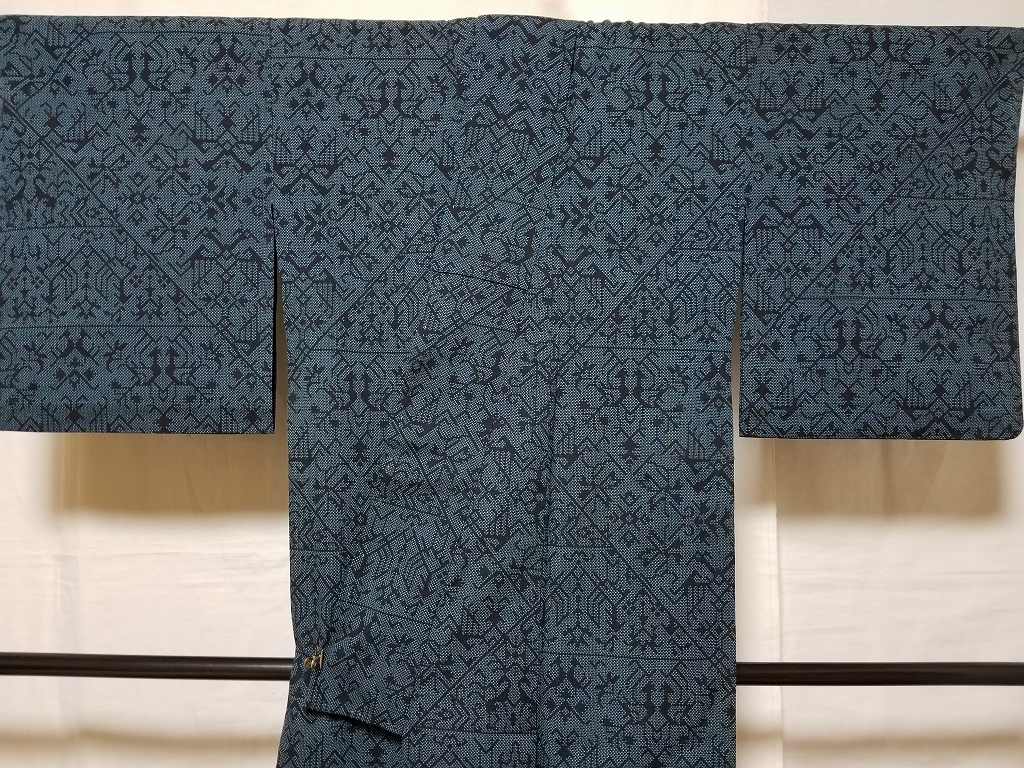 - 「桐輪】単衣仕立*手織紬☆送料無料*黒地*図案.幾何学文様*未使用品{正絹*手織紬*単衣着物}*身丈157-裄63*黒地に図案-幾何学文*№3277
