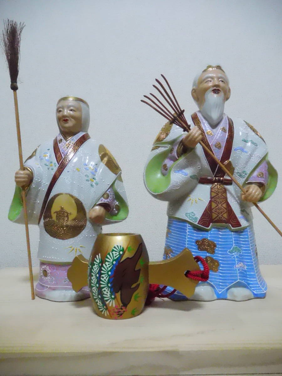 - Y27-147W 置物 高砂人形 打ち出の小槌(木製) 九谷 陶三 陶器 中古 高さ約32cm・28.2cm (T10-1)