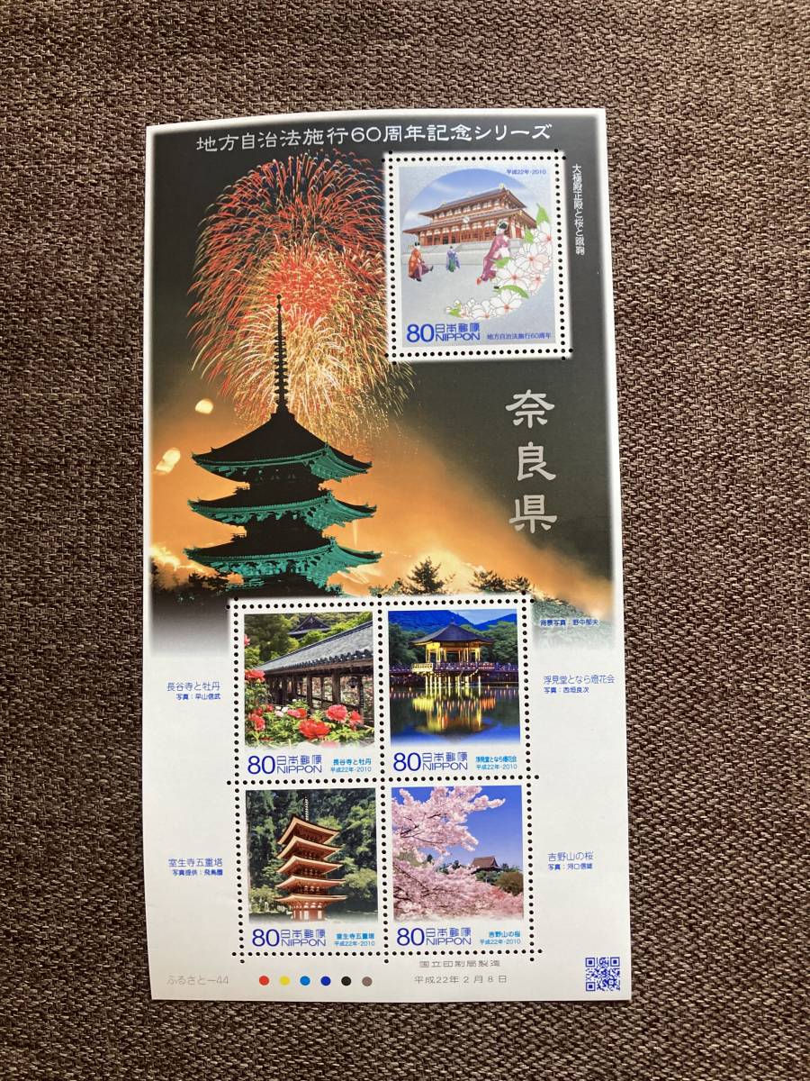 - ★未使用 ふるさと切手 地方自治法施行60周年記念 奈良県 大極殿 桜 蹴鞠 長谷寺 牡丹 浮見堂 室生寺五重塔 吉野山 平成22年2010年 80円5枚