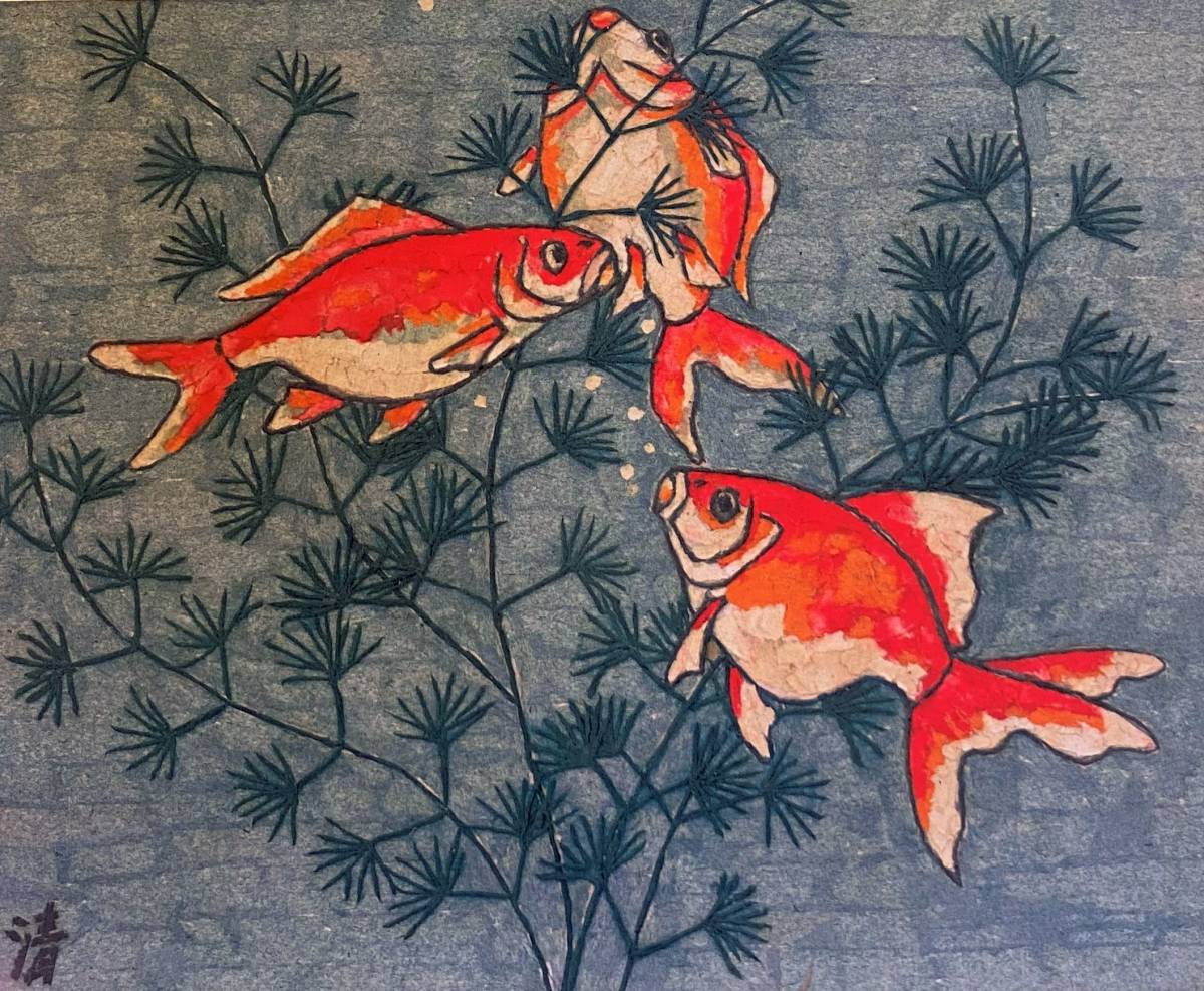 - 山下清、〈金魚に梅花藻〉、希少画集画、高級新品額・額装付、状態良好、送料無料