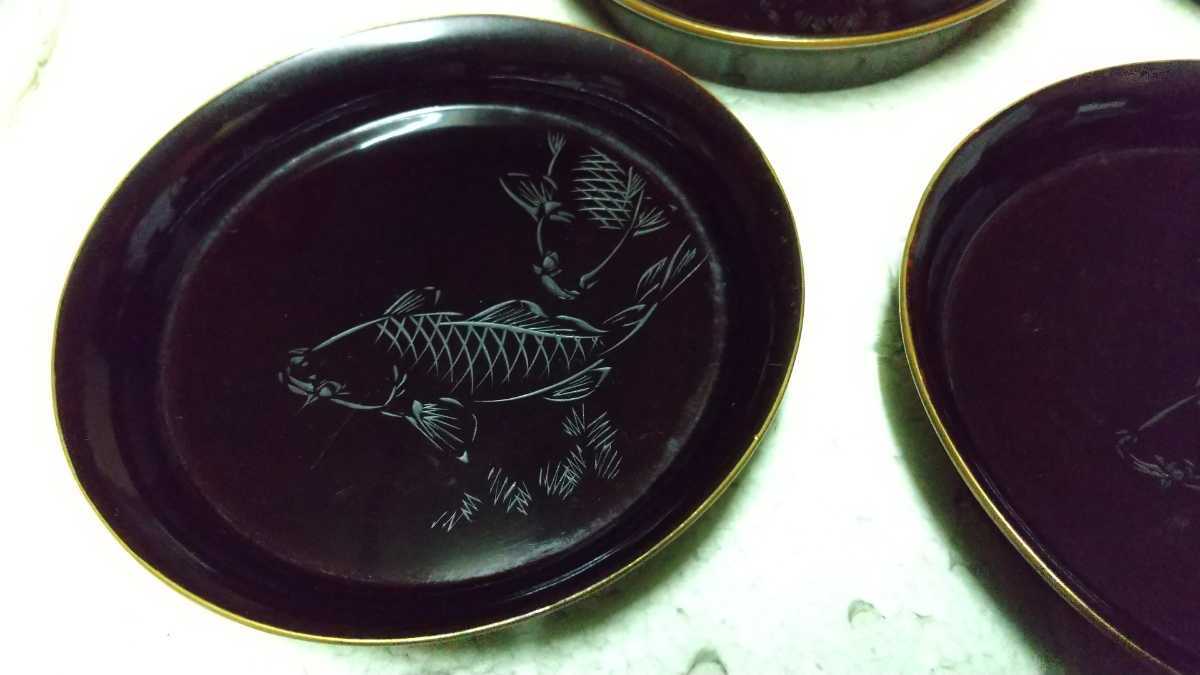 - 漆塗り 鯉画 輪島塗? 会津塗? 塗り物 木製 5枚 皿 木皿