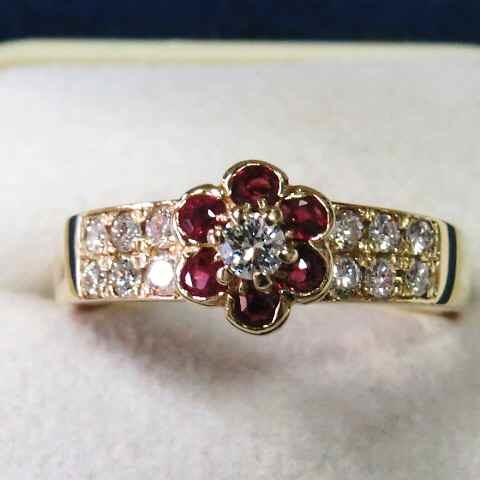 > 【値下げ交渉は質問欄より】クイーンジュエリー(AQ)☆ルビー&ダイヤの750(K18YG)製デザイン指輪☆ピカピカ逸品リング♪♪