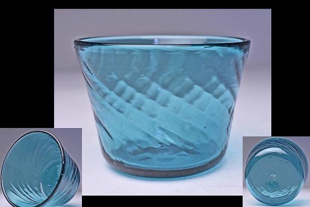 > 倉敷ガラス ★ 小谷眞三 か ★ 硝子 猪口 ★ 独特の緑がかった青 ★ ロックグラス そば猪口 ★ 岡山 民芸 ★ 小谷真三 ★手吹 ポンテ跡 a