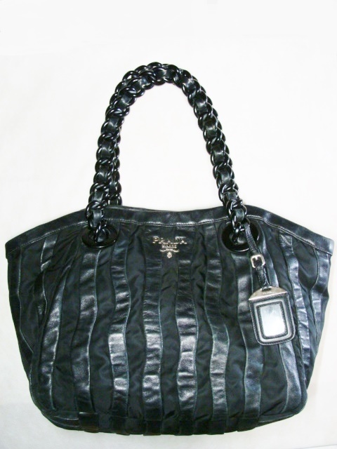 > PRADA プラダ ◇ クリムソン ポコノ ナイロン ストライプ 柄 ナッパ レザー 皮 革 プラスチック チェーン バッグ 鞄