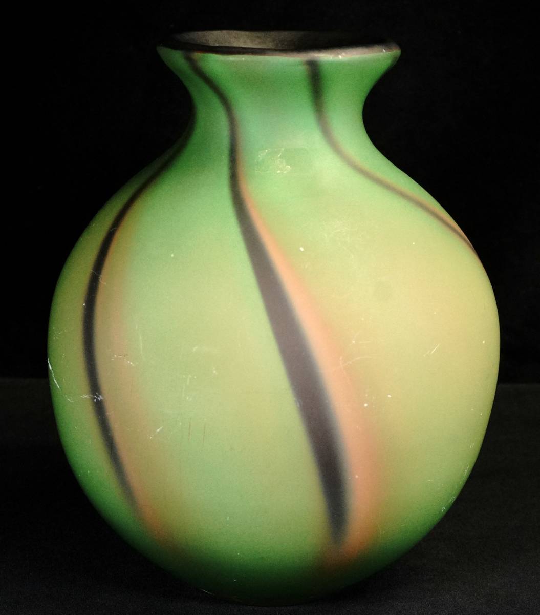 > ビンテージ ガラス製 デザインフラワーベース ハンドメイド アートガラス グリーン 縞模様 高さ22.5㎝ 磨りガラスのマットな質感 TKM