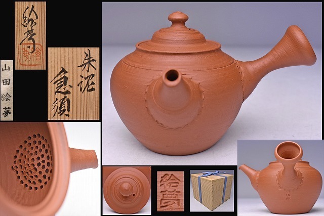 > 山田絵夢 山田常山4代 ★ 朱泥 急須 ★ 共箱 栞 ★ 父: 人間国宝 山田常山 ★ 造形のバランスが素晴らしい逸品 ★ 煎茶道具 常滑焼