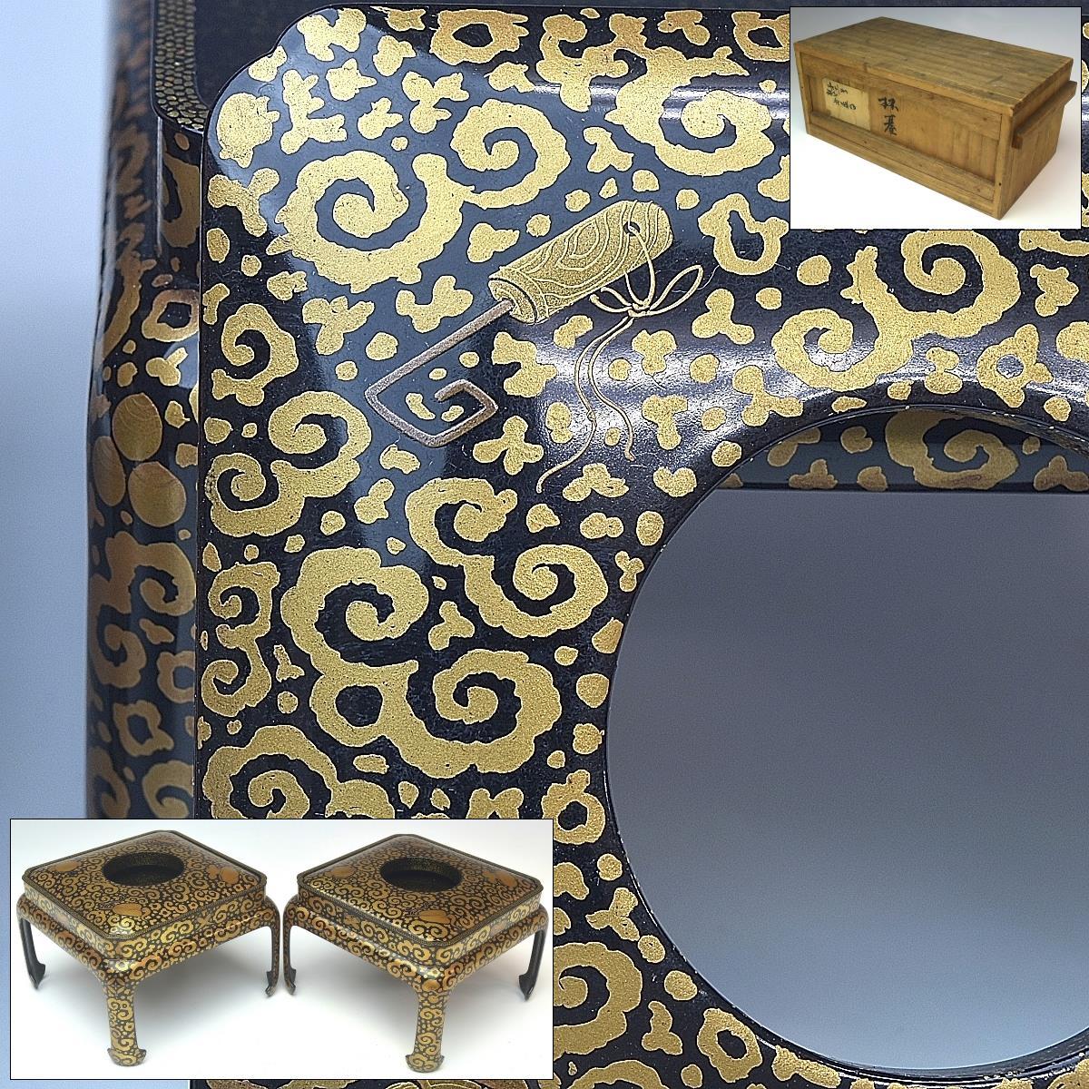 - 【趣楽】 明治時代 吉祥文細密蒔絵盃台一対 上質蒔絵 本物保証 B1731
