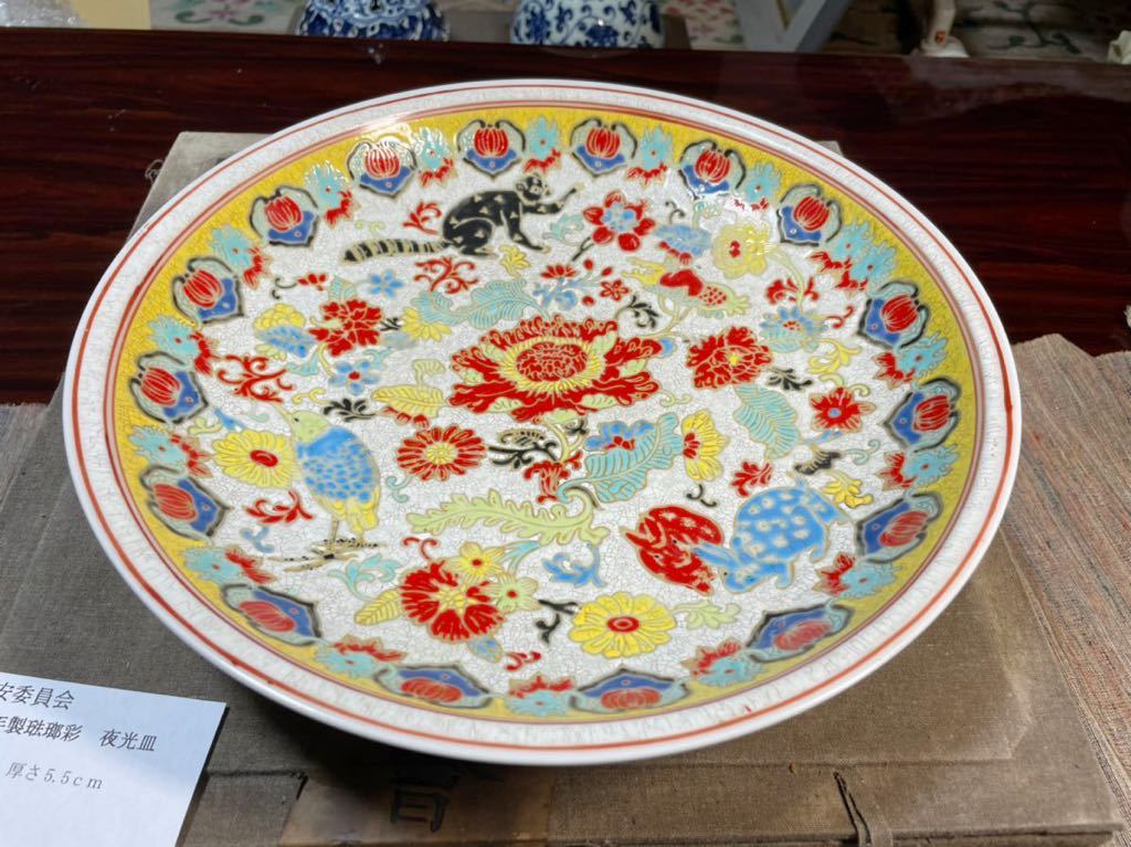 > 【中国美術】北平故宮保安委員会 大清乾隆年製琺瑯彩 夜行皿 大皿 D30.6xH5.5cm 重量1.9kg 中華人民共和国 故宮 骨董黄色動物古玩 飾皿中国