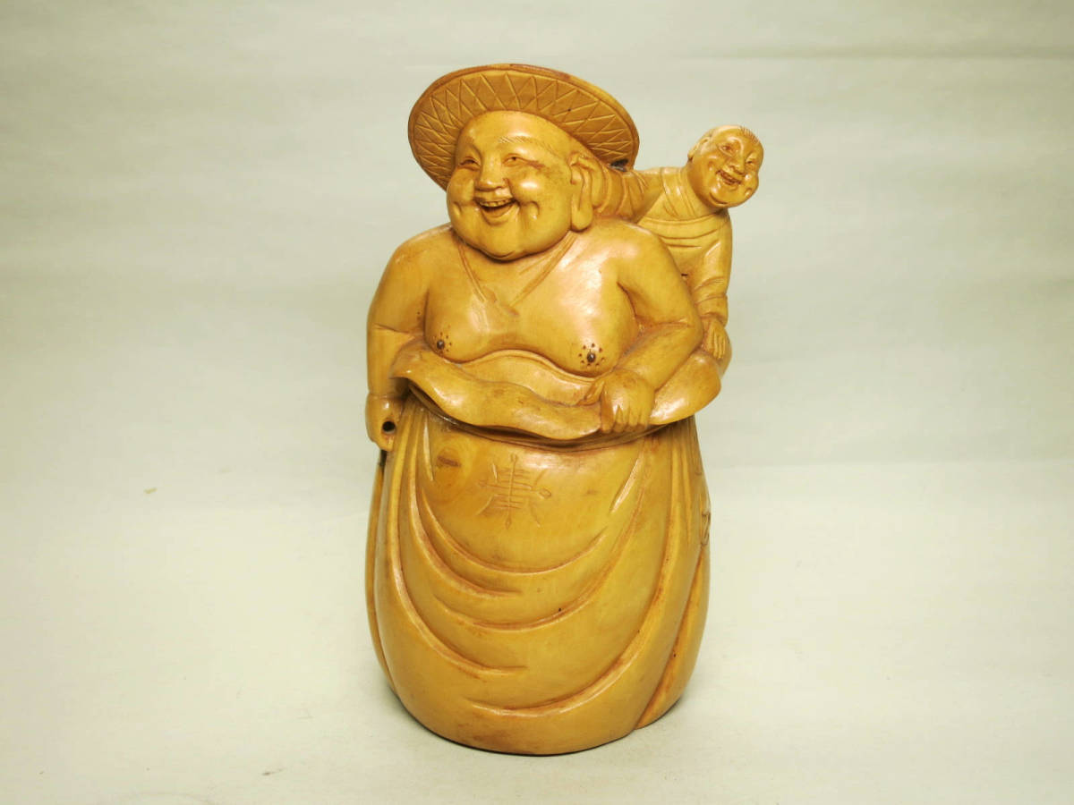 - [大幸] 中国制造 柘植材`布袋と童`像 古玩 良品 木彫置物 吉祥 縁起物 福禄寿 天然木