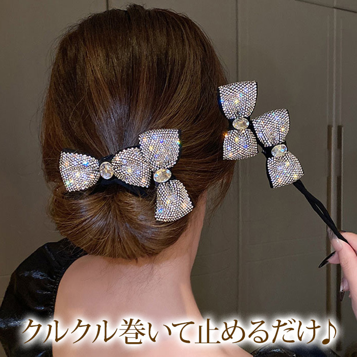 - お団子ヘア リボン ヘアアクセサリー ワイヤー ラインストーン キラキラ 韓国ファッション 韓国 シンプル 浴衣 パーティー ギブソンタック