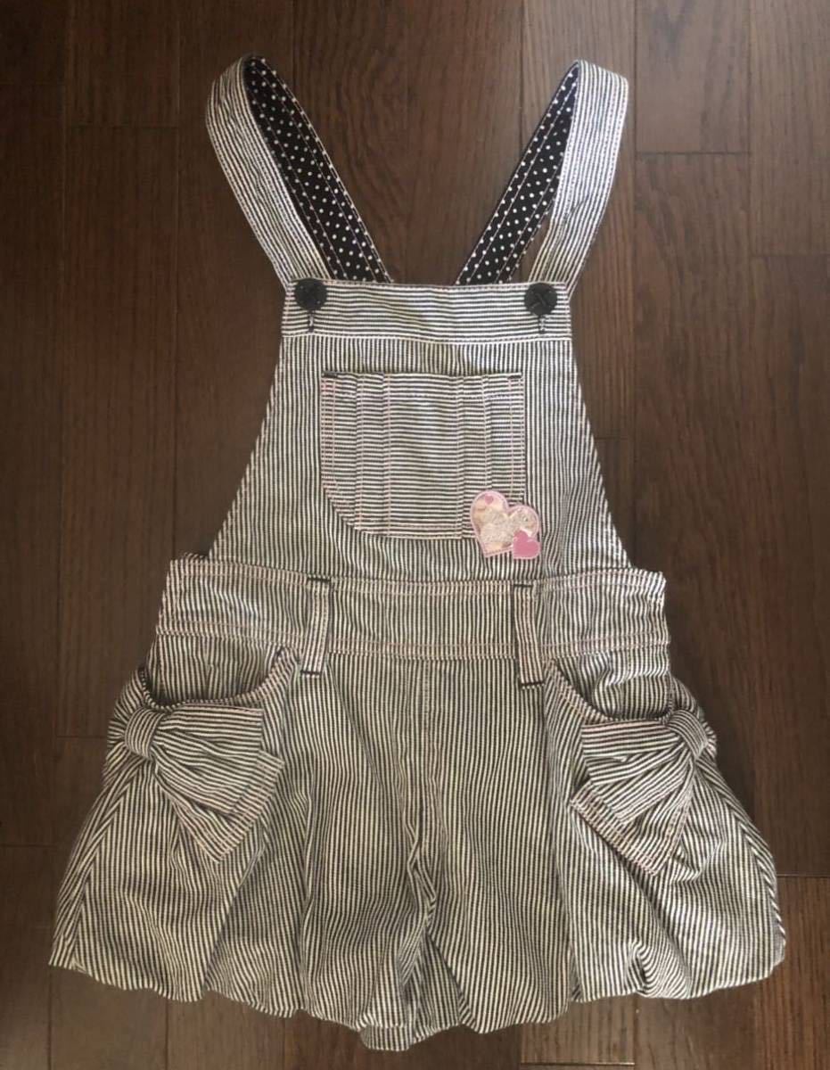 > mezzo piano デザイン◎両サイドの大きなリボンポケットが可愛いオーバーオール大きめフリルのカボチャショートパンツ ストライプ水玉130