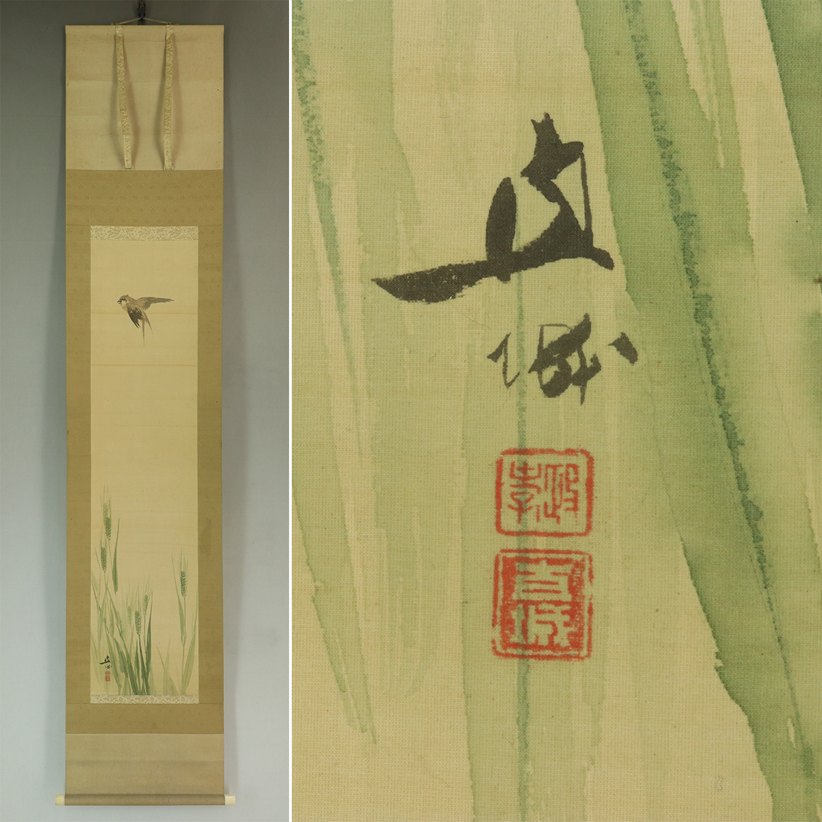 - 【真作】深田直城【青麦に小禽】◆絹本◆合箱◆掛軸 u06037