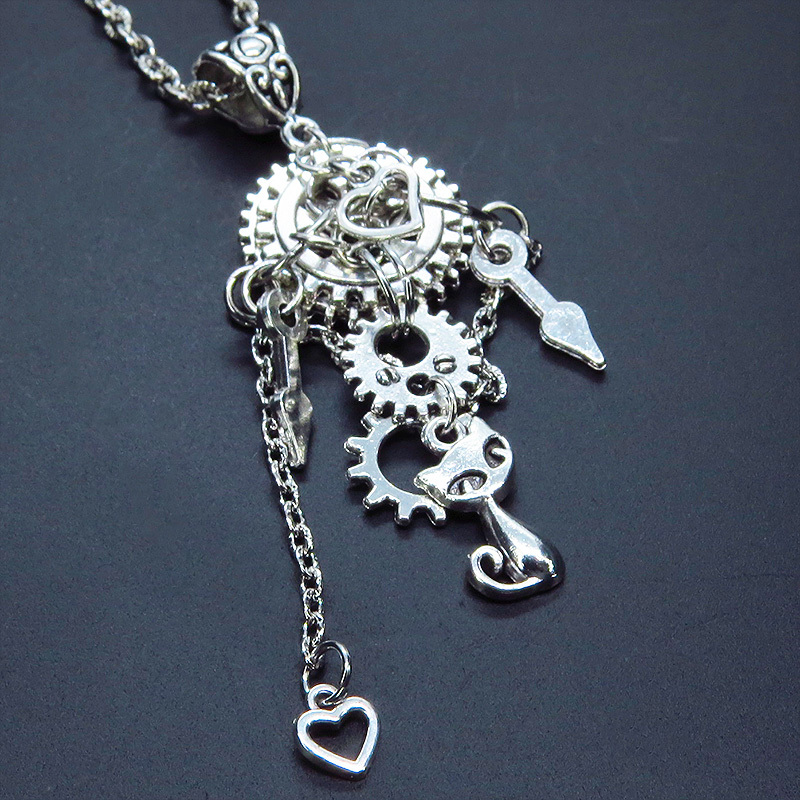 - アンティークシルバー 猫と歯車・チェーンのスチームパンク風ネックレス ハート アジャスター付 長さ変更可