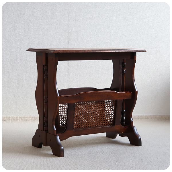 - イギリス アンティーク調 マガジンラック付きサイドテーブル/収納家具/店舗什器/ディスプレイ【籐(ラタン)がステキ】T-682