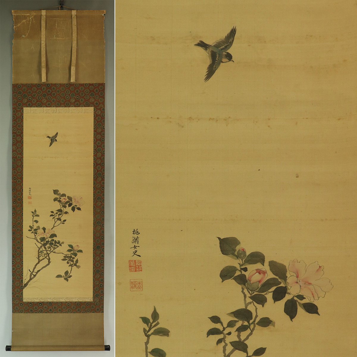 - 【肉筆】在銘【花鳥図】◆絹本◆掛軸 u06186