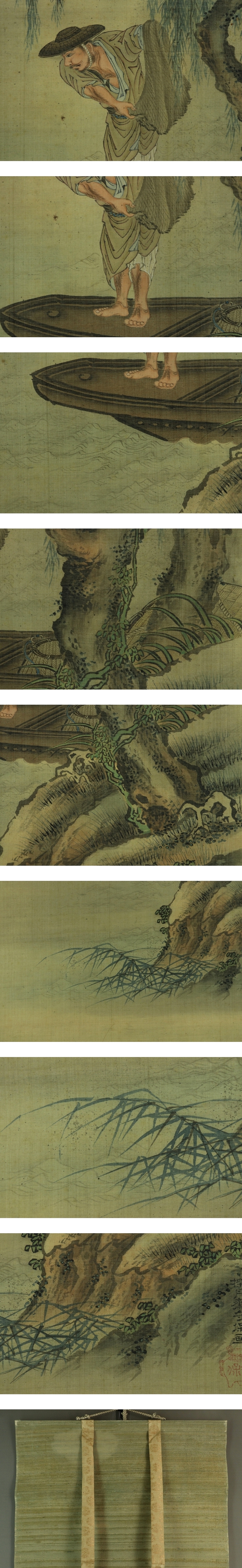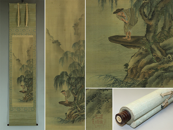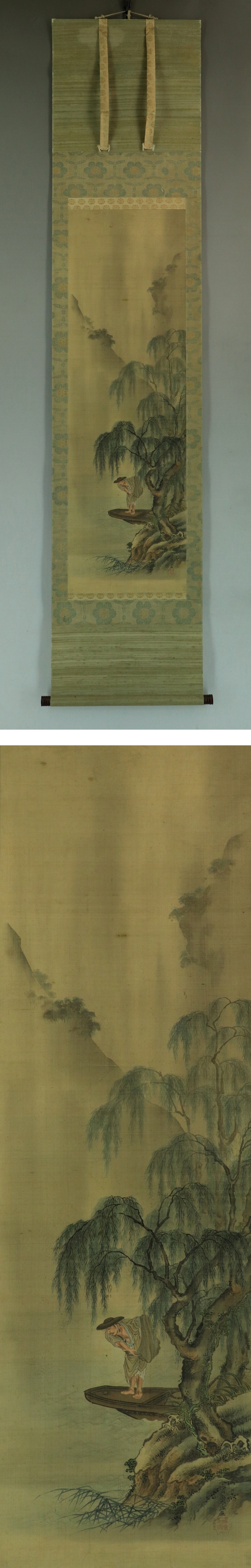 - 名品【真作】樋口探月【雨中柳陰漁夫】◆絹本◆合箱◆掛軸 u10059