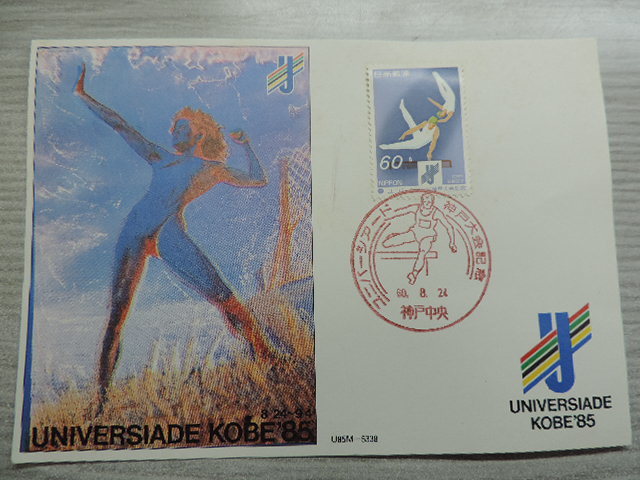 > ★ユニバーシアード神戸大会記念 初日カバー★ 1985年 60,8,24神戸中央消印 60円切手・記念はがき付