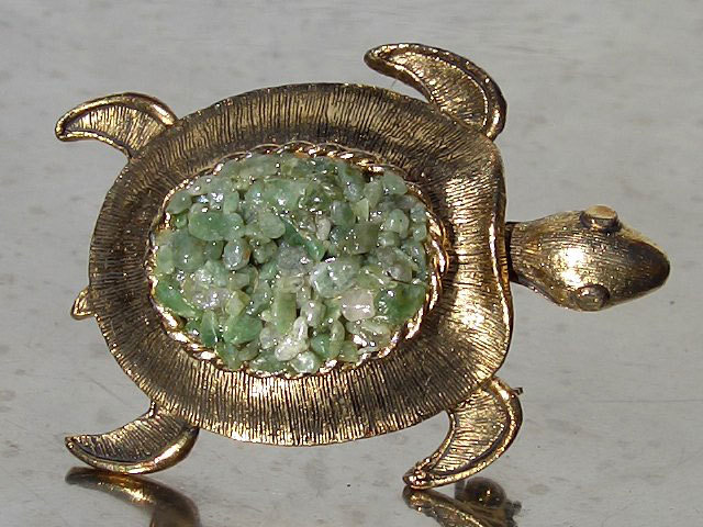 > †80S 南国 HAWAII 大海を自由奔放に海遊 赤ウミガメ アオウミガメ タイマイ 海亀ブローチ 真鍮×天然石グリーンアパタイト レトロ 美品
