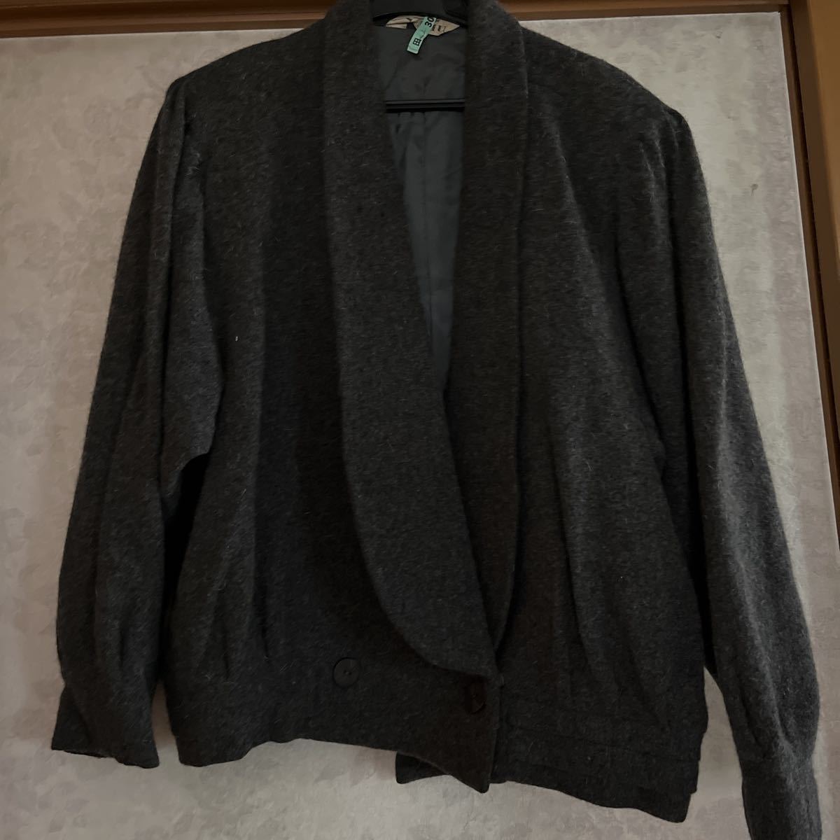 - ★★MEIMU★★ジャケット グレー 毛60%ナイロン20%アンゴラ20%裏地キュプラ100% ゆったり襟とタックのデザイン 肩パッド入り