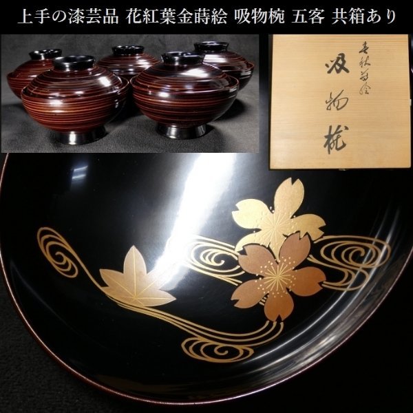 【 恵 #0464 】 上手の漆芸品 花紅葉金蒔絵 吸物椀 五客 共箱あり 検:椀/蒔絵/漆器