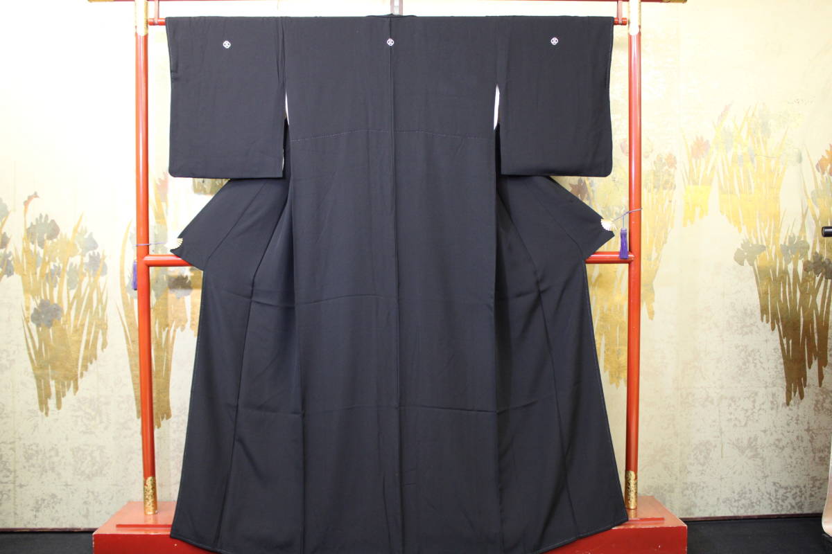 > きもの今昔4820 黒の礼装 広衿袷喪服正絹一越 各所にぐし縫い有り 家紋「隅切角に三の字」 身丈159cm