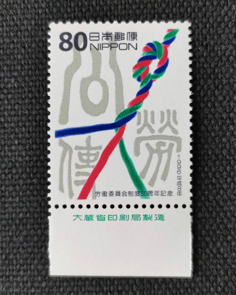 - [23030317]【労働委員会制度50周年記念】単片 銘版付「公・労・使の文字と綱」80円 1996年発行 美品*
