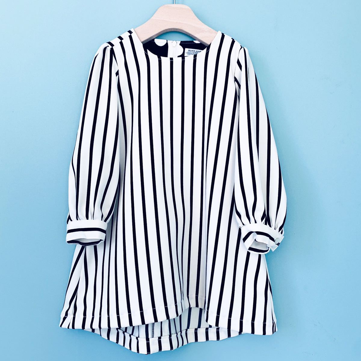 > 【新品未使用】BLUEU AZUR ブルーアズール 100cm ワンピース オフホワイト 白 黒 ストライプ 長袖 オケージョン フォーマル 日本製
