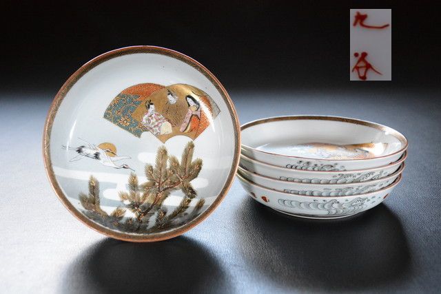 - 【十三】 九谷色絵扇波千鳥紋皿 五枚揃 検索用語→A0152金彩色彩小皿手塩皿中皿懐石料理