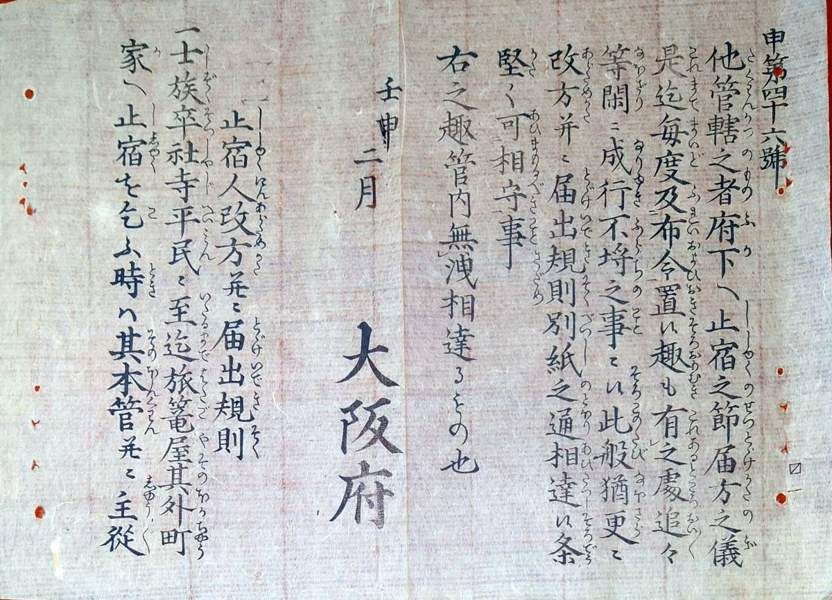 - f23032407〇明治布告 他管轄の者 止宿之節 届方の儀 止宿人改方並びに届出規則 明治5年 大阪府〇和本古書古文書