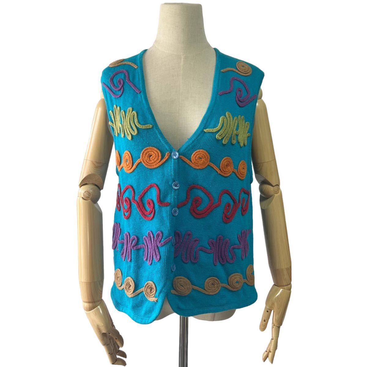 - 【1980s】ビンテージ デザイン刺繍 ニットベスト Vネック セーター 古着 アート ハンドメイド レア
