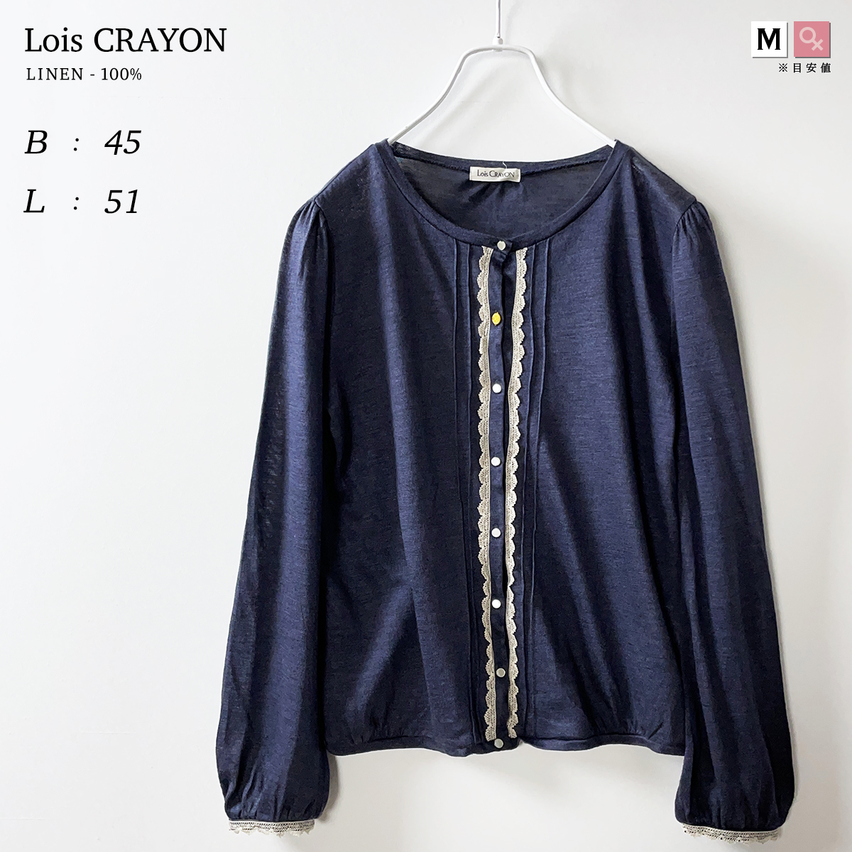 > Lois CRAYON 麻 100% リネン 薄手 レース 刺繍 カーディガン 紺 ネイビー 青 ブルー 春 夏 秋 ざっくり 丸首 ショート ロイスクレヨン 9号