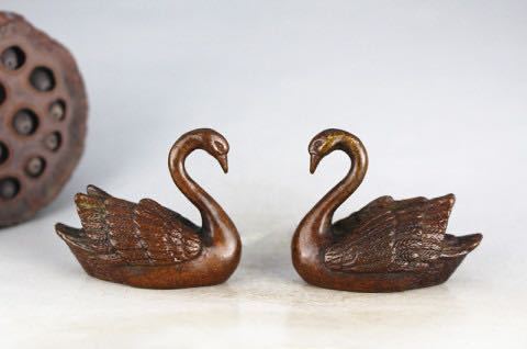 - 極美古銅質感 実心 細工 ハート型 縁起物 愛のガチョウ 銅茶道具置物2点