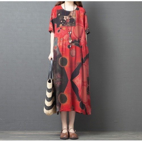 - ZPT081★新品不思議なドット柄がとっても個性的 大きいサイズ 半そでコットン風素材とってもゆったりロング丈ワンピ 赤