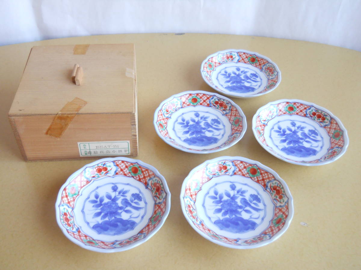 > 赤絵花鳥 小皿揃 約12㎝の小皿/プレート 5枚入り 嘉山 木箱付き ●昭和レトロ コレクション
