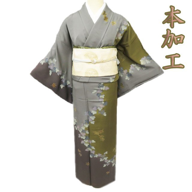 > ★きもの北條★ 本加工 葉っぱ模様 落ち着きある艶やかな装いに 璃寛茶色 鼠色 着物 訪問着 A802-2 M 【中古】