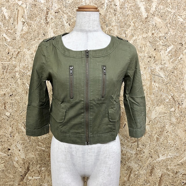 - フリーズショップ FREE'S SHOP ノーカラー ジップシャツジャケット ショート 7分袖 無地 綿×麻 S ミリタリーグリーン・カーキ レディース