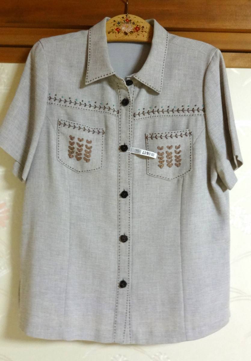 - USED!洒落たベージュ半袖厚手ブラウス、ビーズ・リボン、刺繍入り、レリアン+13サイズ、クリーニング済