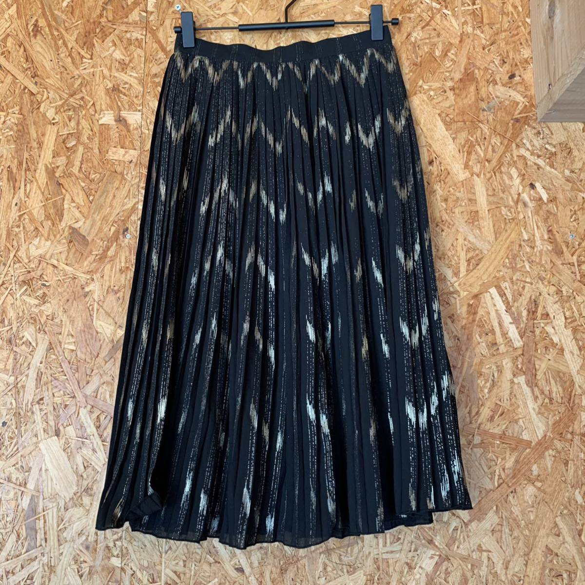 > 美品 SENSE PLACE アーバンリサーチ プリーツスカート 膝丈スカート ミモレ丈 スカート ブラック ゴールド 総柄 1958