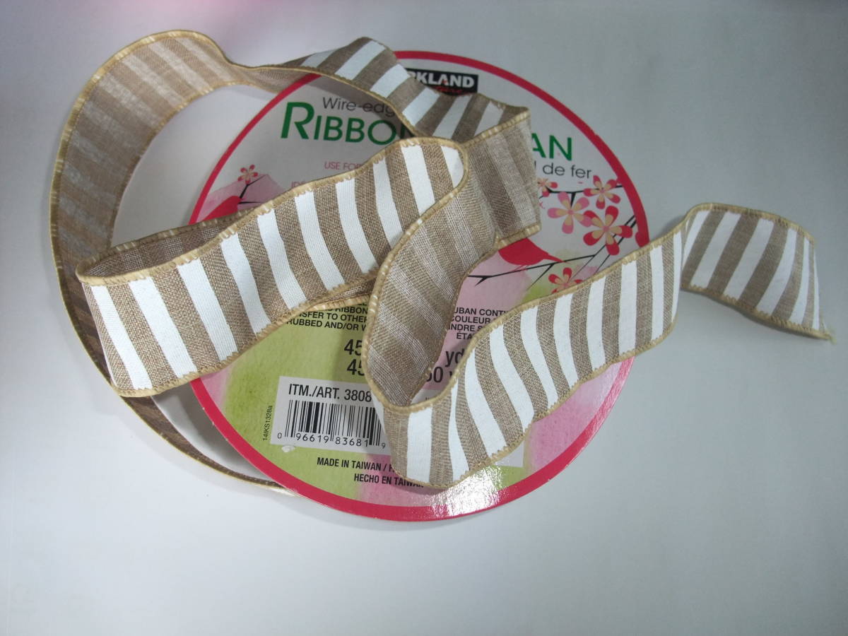 - ワイヤー入りリボン ベージュx白 4㎝x44m