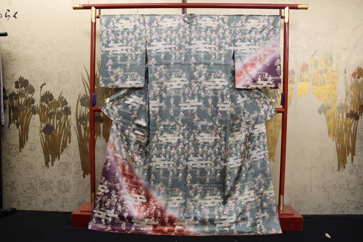 > きもの今昔5437 附下訪問着 正絹広衿袷仕立抹茶色地裾ボカシ 枝垂れ桜とエ霞雲取総模様柄 刺繍入り 身丈170cm