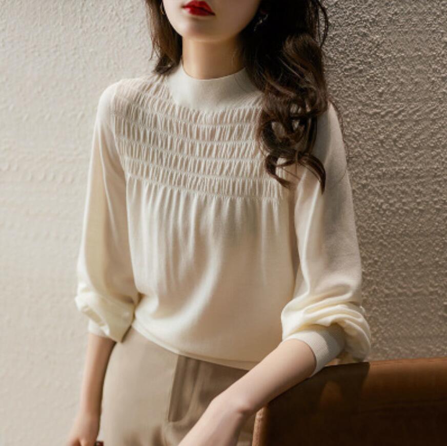 - 秋冬季 レディース セーター 上質 おしゃれ ウール混 薄め カシュクール ギャザー ニットトップス / ホワイト
