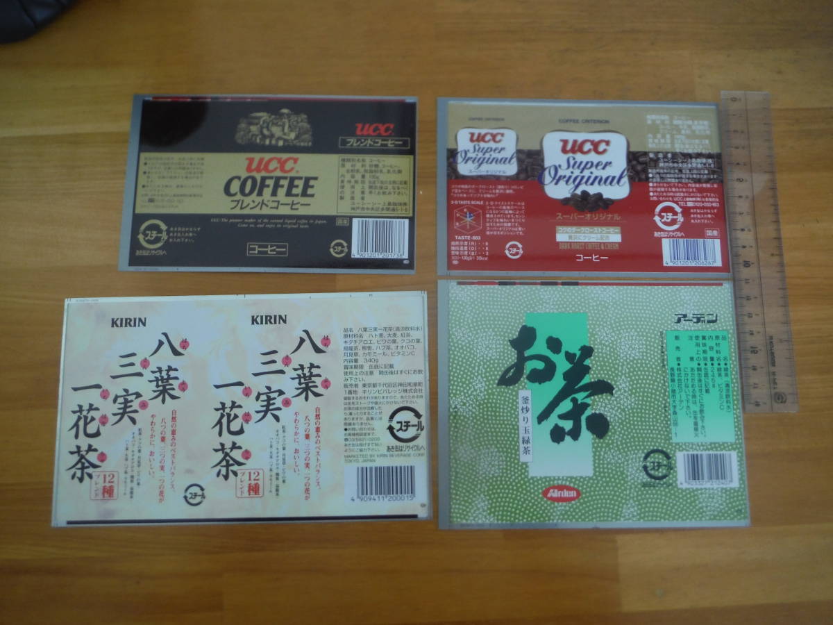 - H0851 ドリンク缶 ラベル まとめて4枚セット 食品パッケージ? UCC COFFEE ブレンドコーヒー SUPER ORIGINAL KIRIN 八葉 三実 一花茶 お茶